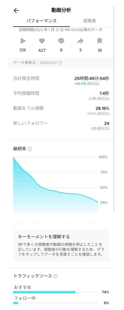 例えば、こんなデータをチェックすることで、TikTokに評価されやすい動画を作ることができます。
